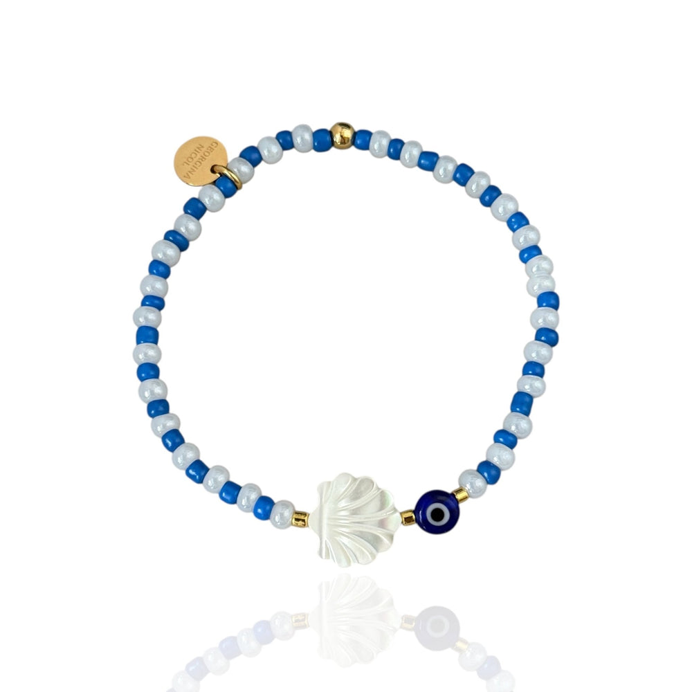 Inspired by the timeless beauty of Greece, this bracelet blends serenity and protection. The mother of pearl seashell represents purity and the flow of life, while the blue evil eye bead channels good fortune and wards off negativity. A luminous piece that carries the peaceful rhythm of the sea and the golden warmth of summer.