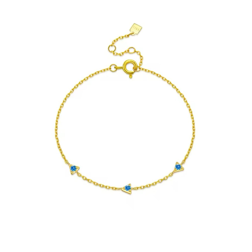 The Blue Cz Triangle Chain Bracelet features a bold triangular charm embellished with shimmering blue cubic zirconia. Crafted from 18k gold-plated 925 sterling silver, this bracelet combines modern design with timeless elegance. Its adjustable fit makes it perfect for adding a unique touch to any outfit, whether casual or formal.