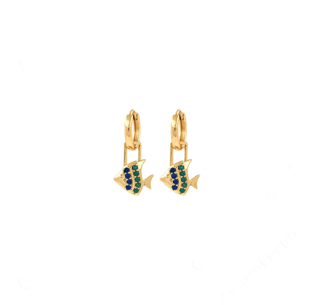 Our dainty dangly golden fish earrings. Inspired by the sun, the sea, and the creatures among it, these 18K gold-plated fish charms with cubic zirconia gems hang just right on golden huggie.