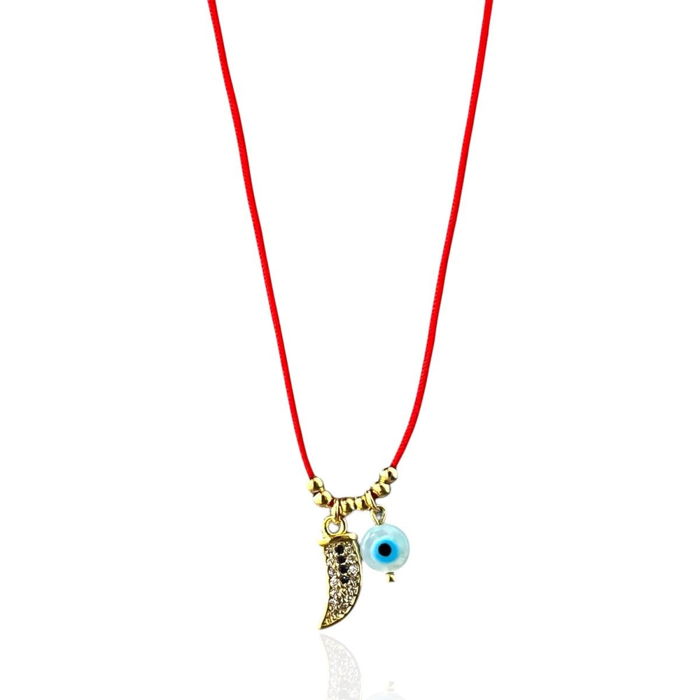 This red string necklace is designed to carry the powerful energy of protection and fortune. Featuring a sparkling cubic zirconia horn and a delicate mother of pearl evil eye, it blends timeless symbolism with an elegant touch. Each element has a deep meaning: the horn represents luck and courage, while the evil eye guards against negativity. Finished with gold accents, this necklace is a modern talisman you can wear every day.