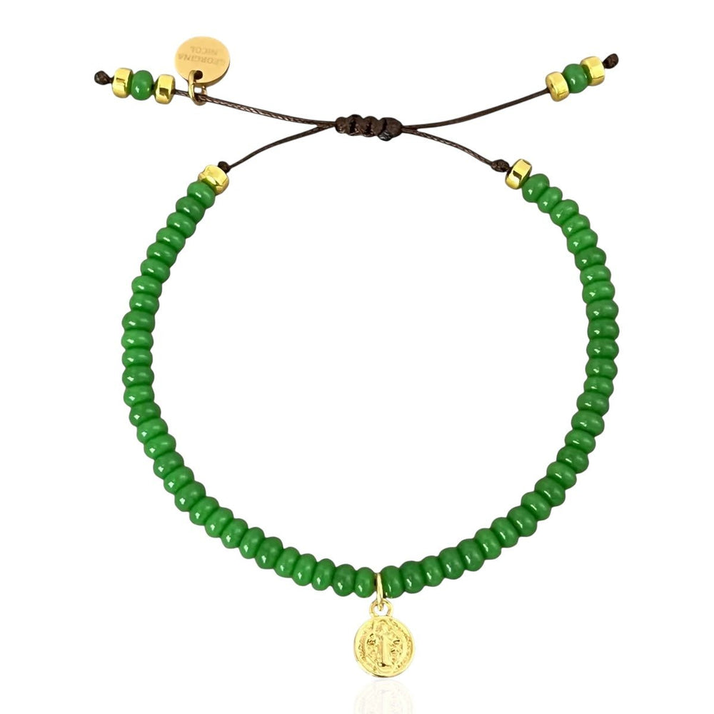 Handmade green beaded bracelet featuring a gold Saint Benedict medal charm. The Saint Benedict medal is known as a symbol of powerful protection and divine guidance. Combined with the healing energy of green beads, this bracelet carries both strength and serenity.