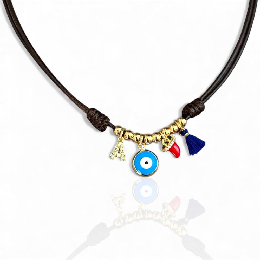A meaningful and personalized necklace designed to bring luck, protection and style into your everyday life. The mix of charms, your CZ initial, the blue enamel evil eye, the tiny Italian Cornicello and the tassel — creates a symbolic blend of clarity, confidence, good energy and personal intention. The brown cord adds an elevated touch, and its adjustable sliding closure allows you to wear it at the exact length you desire.